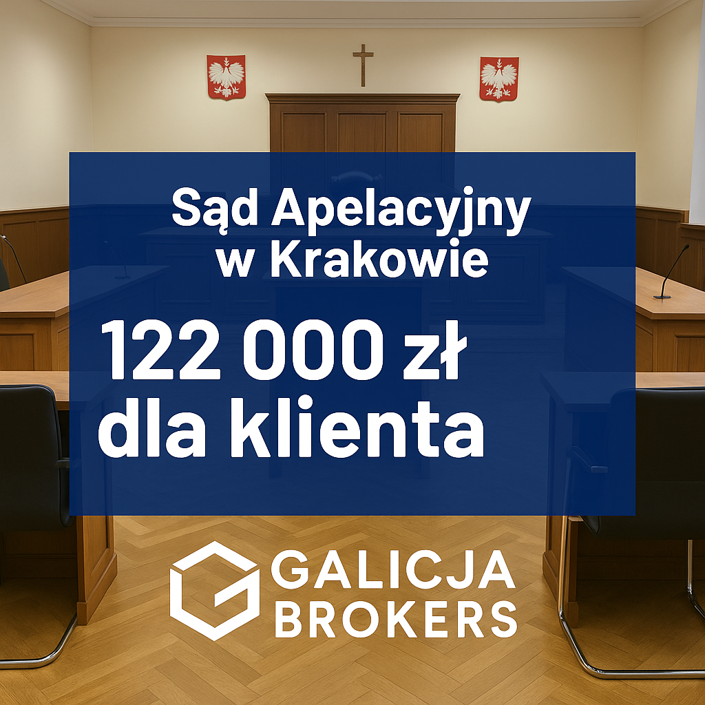 Niemal 122 000 zł z odsetkami ustawowymi od lutego 2021 r. – tyle zasądził Sąd Apelacyjny w Krakowie od Towarzystwa Ubezpieczeń na rzecz klienta Galicji Brokers, którego reprezentowałem.